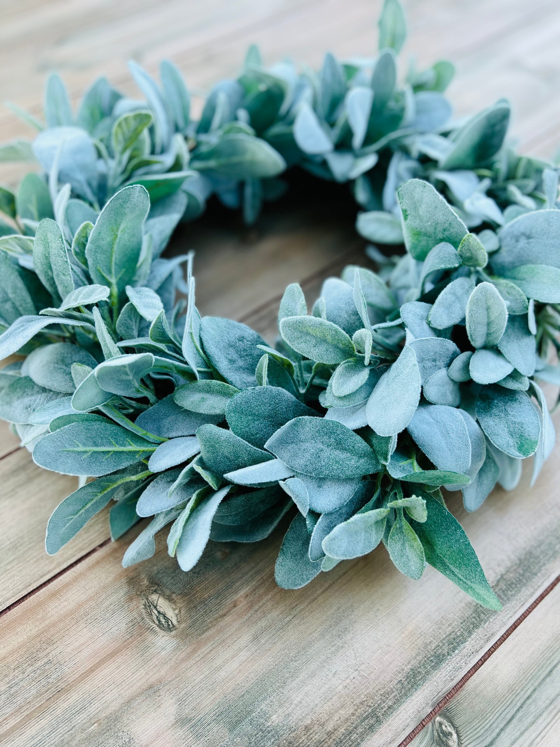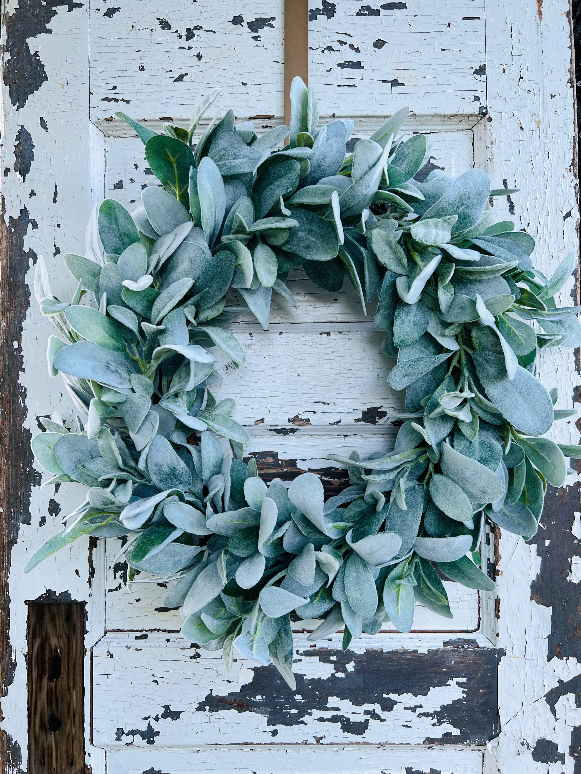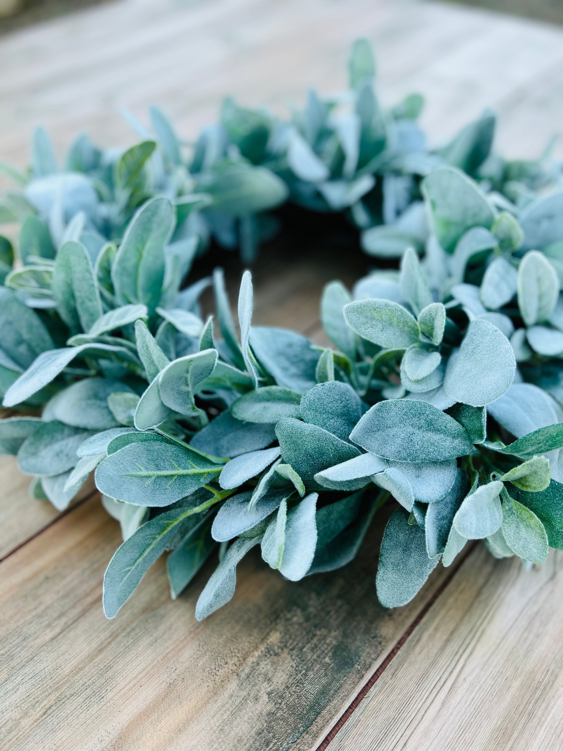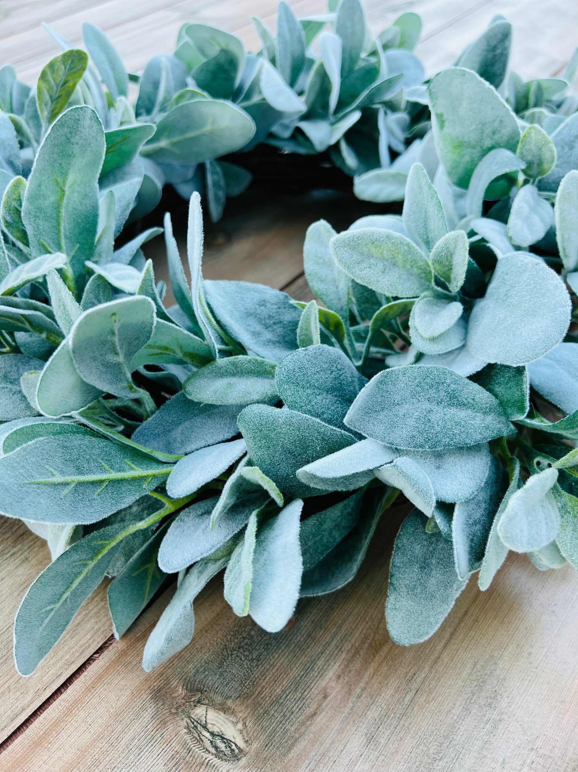 "Lamb" is featured on a rustic grapevine wreath base and is detailed with soft fuzzy Lamb's ear leaves.