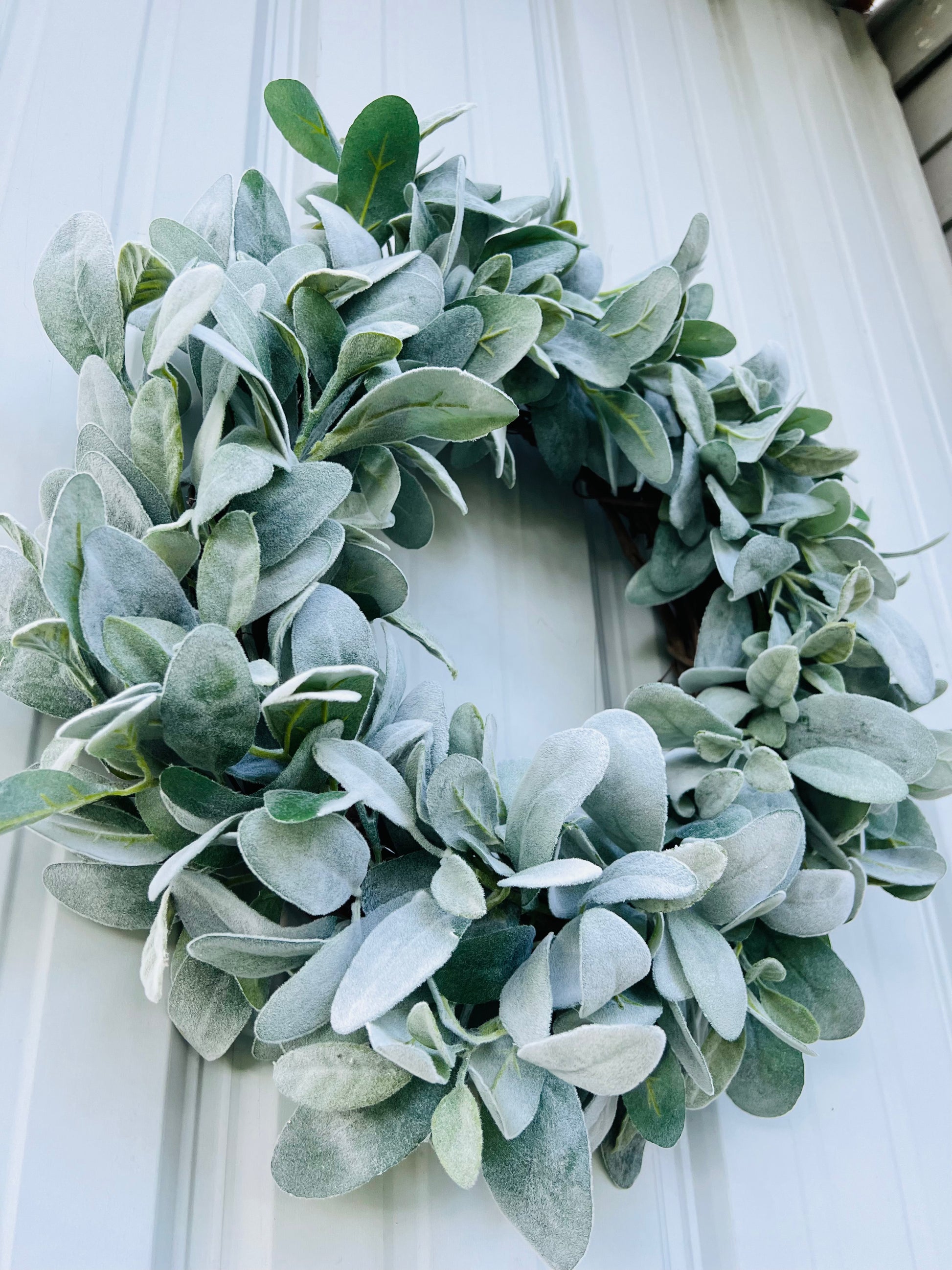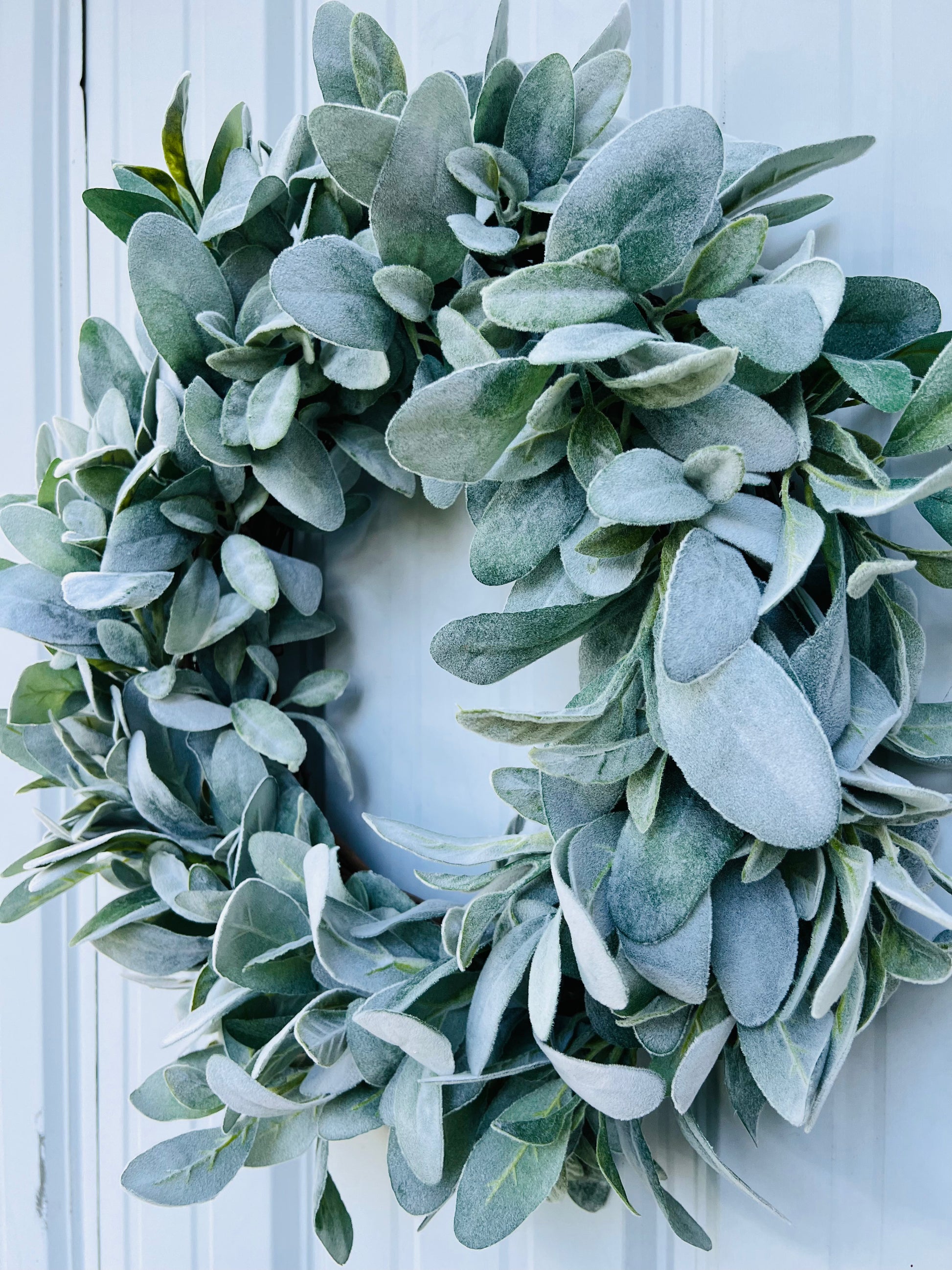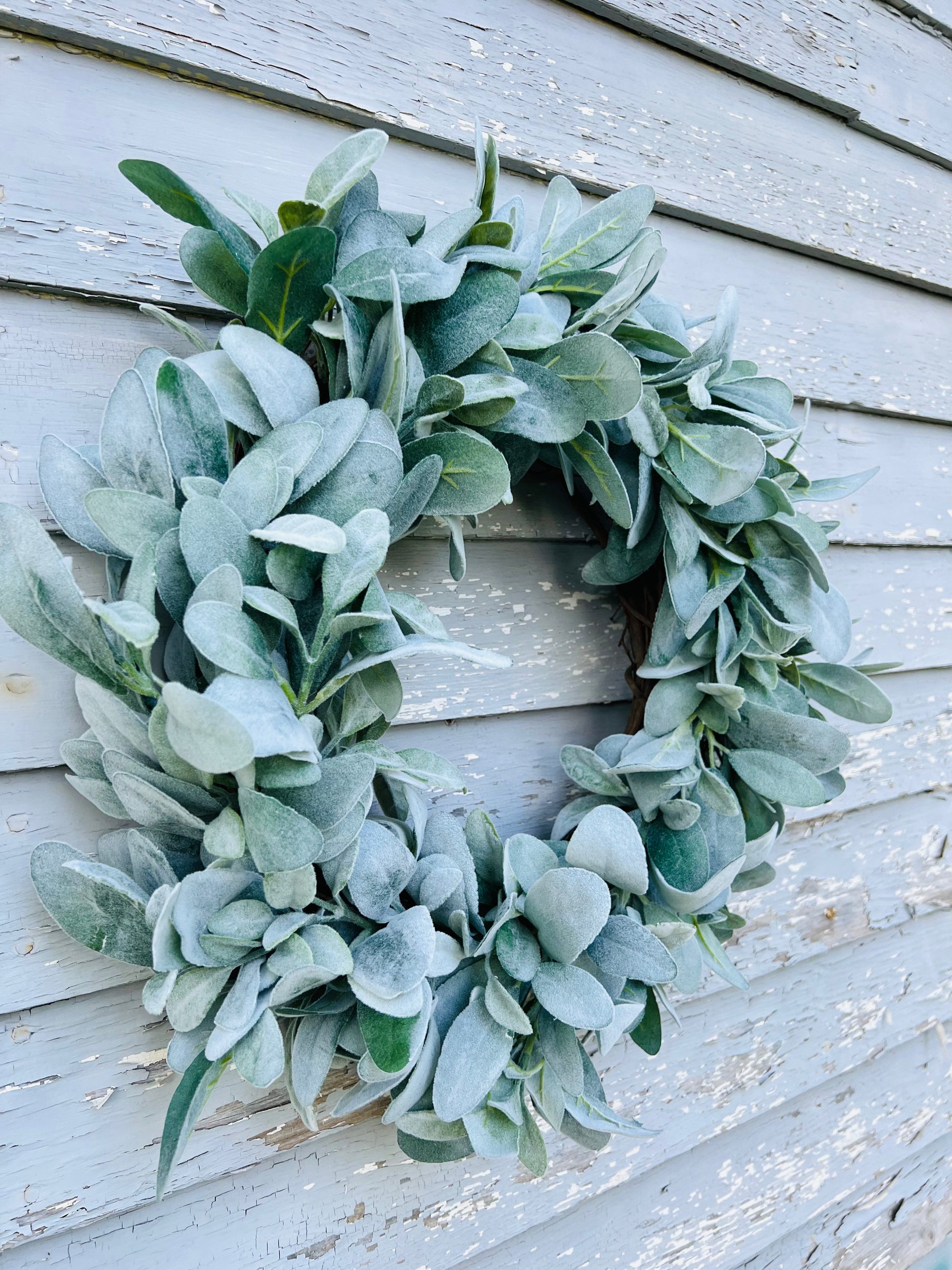 "Lamb" is featured on a rustic grapevine wreath base and is detailed with soft fuzzy Lamb's ear leaves.