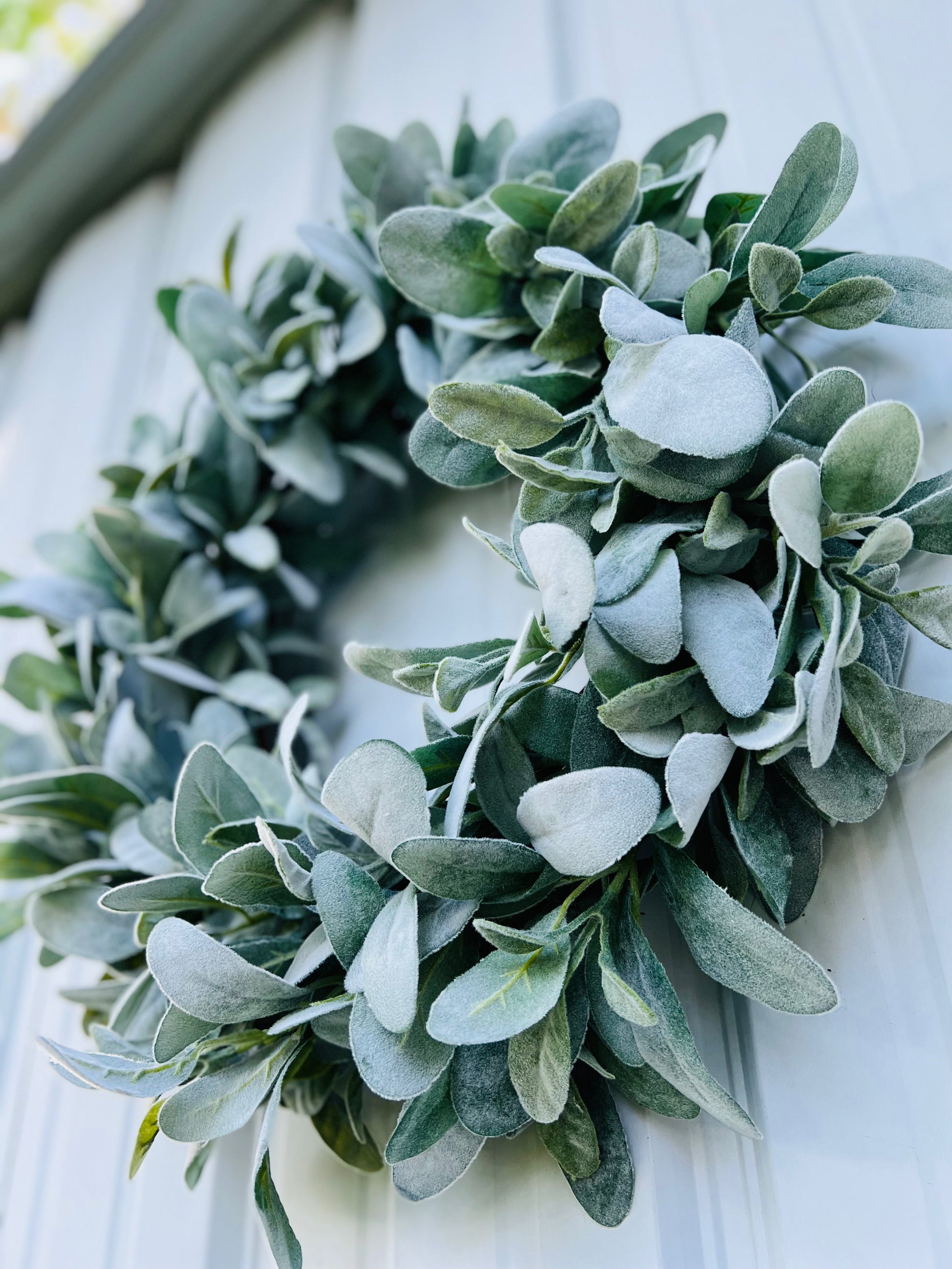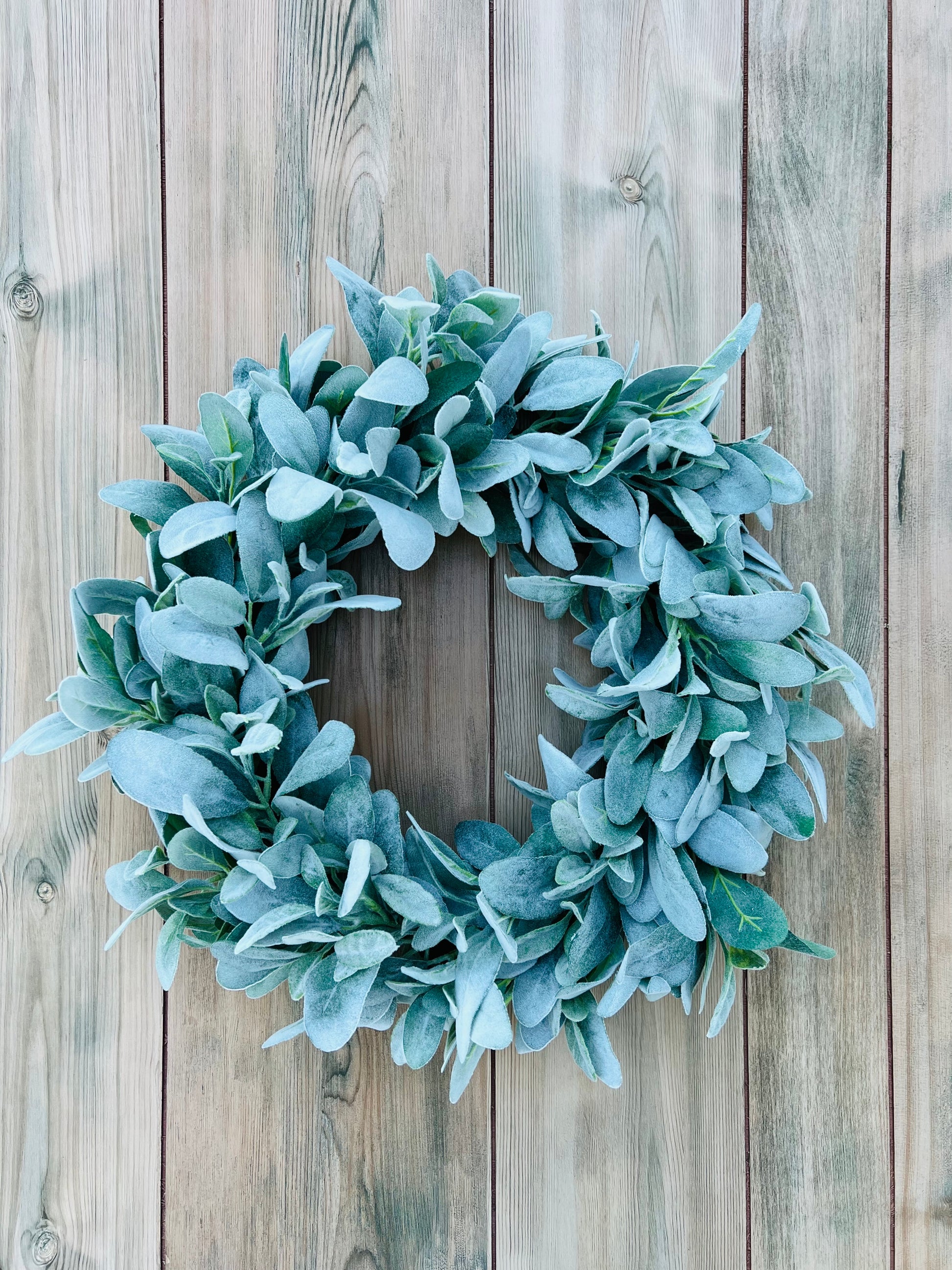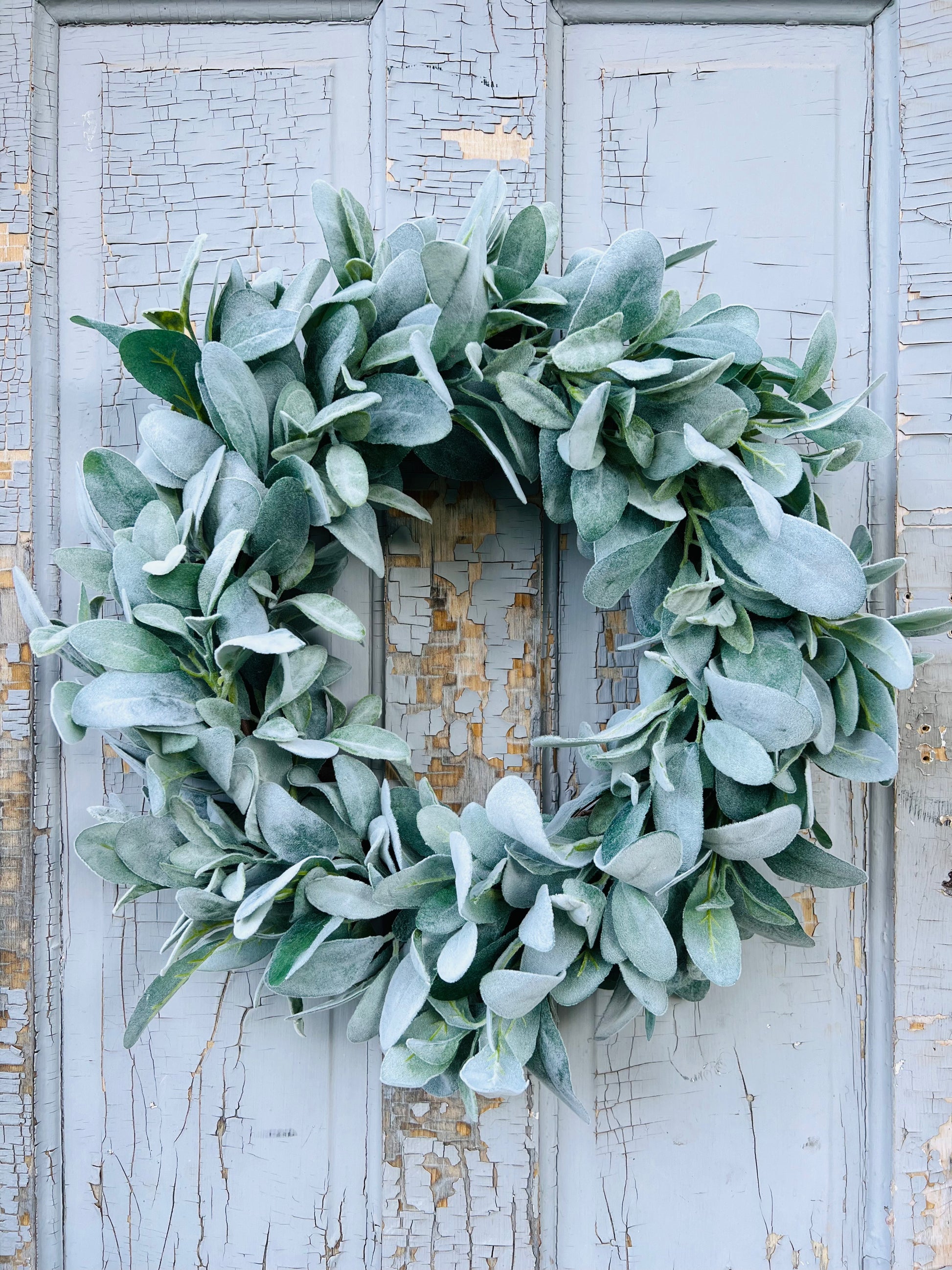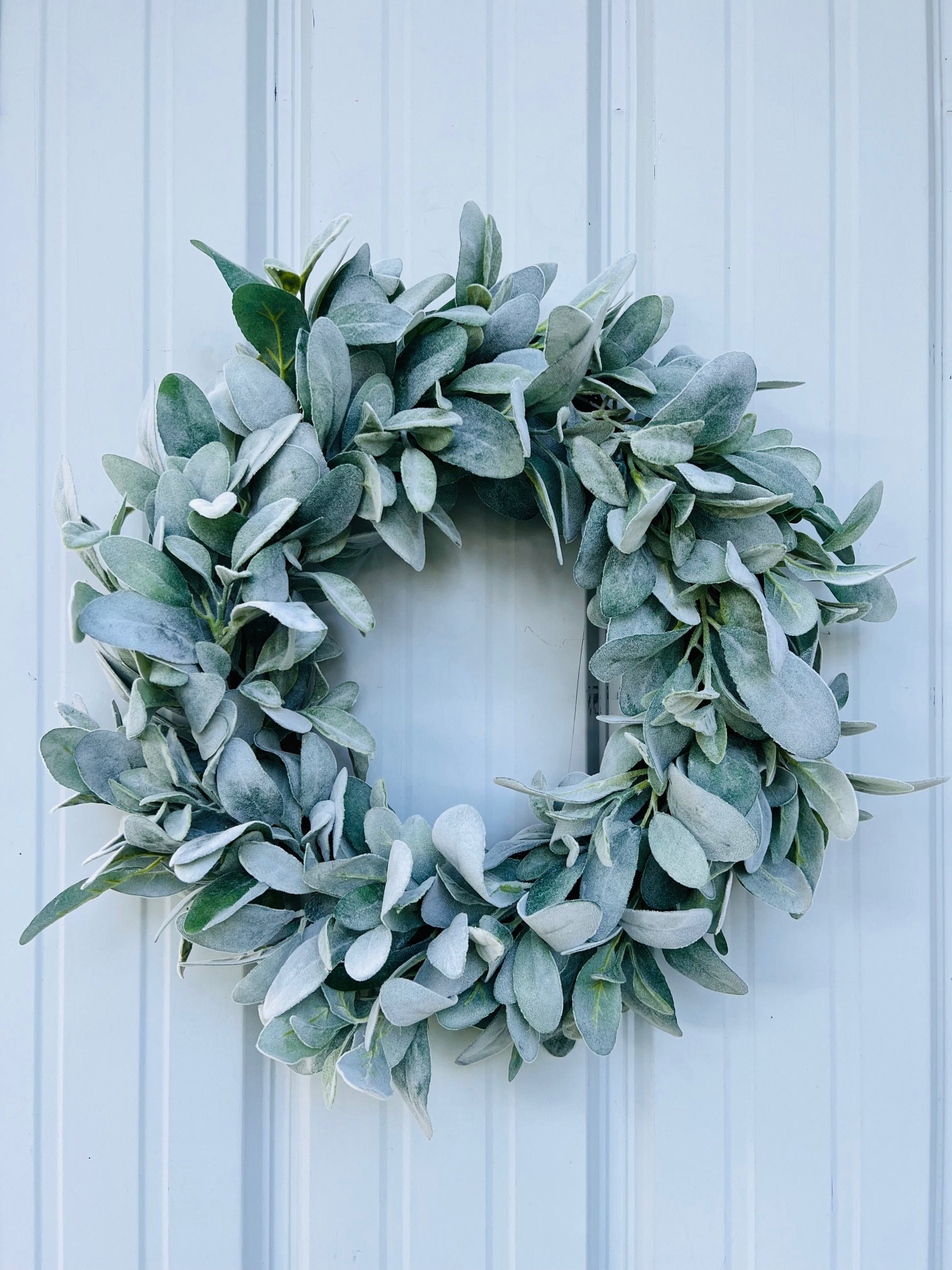 "Lamb" is featured on a rustic grapevine wreath base and is detailed with soft fuzzy Lamb's ear leaves.