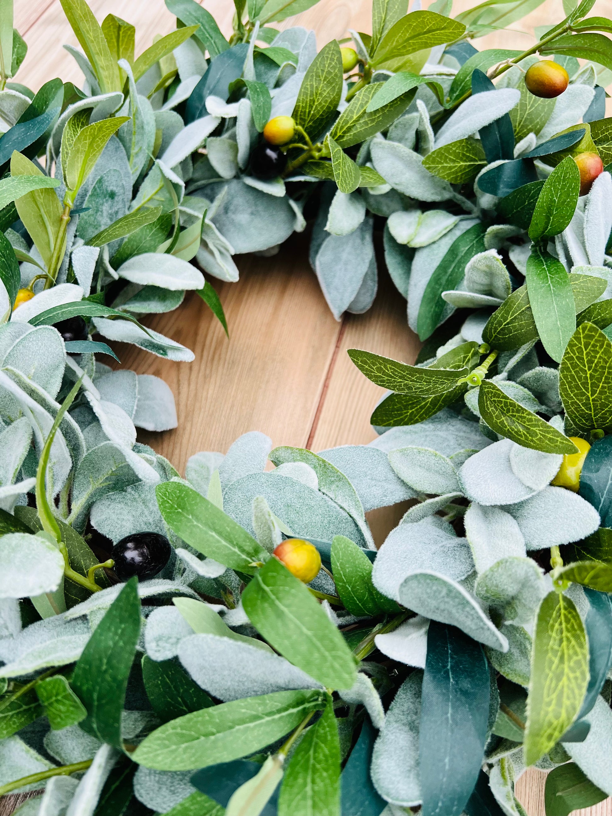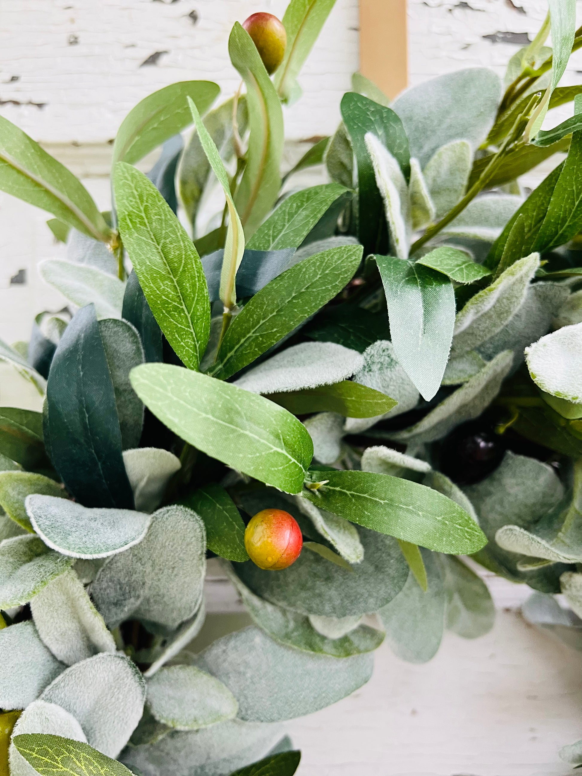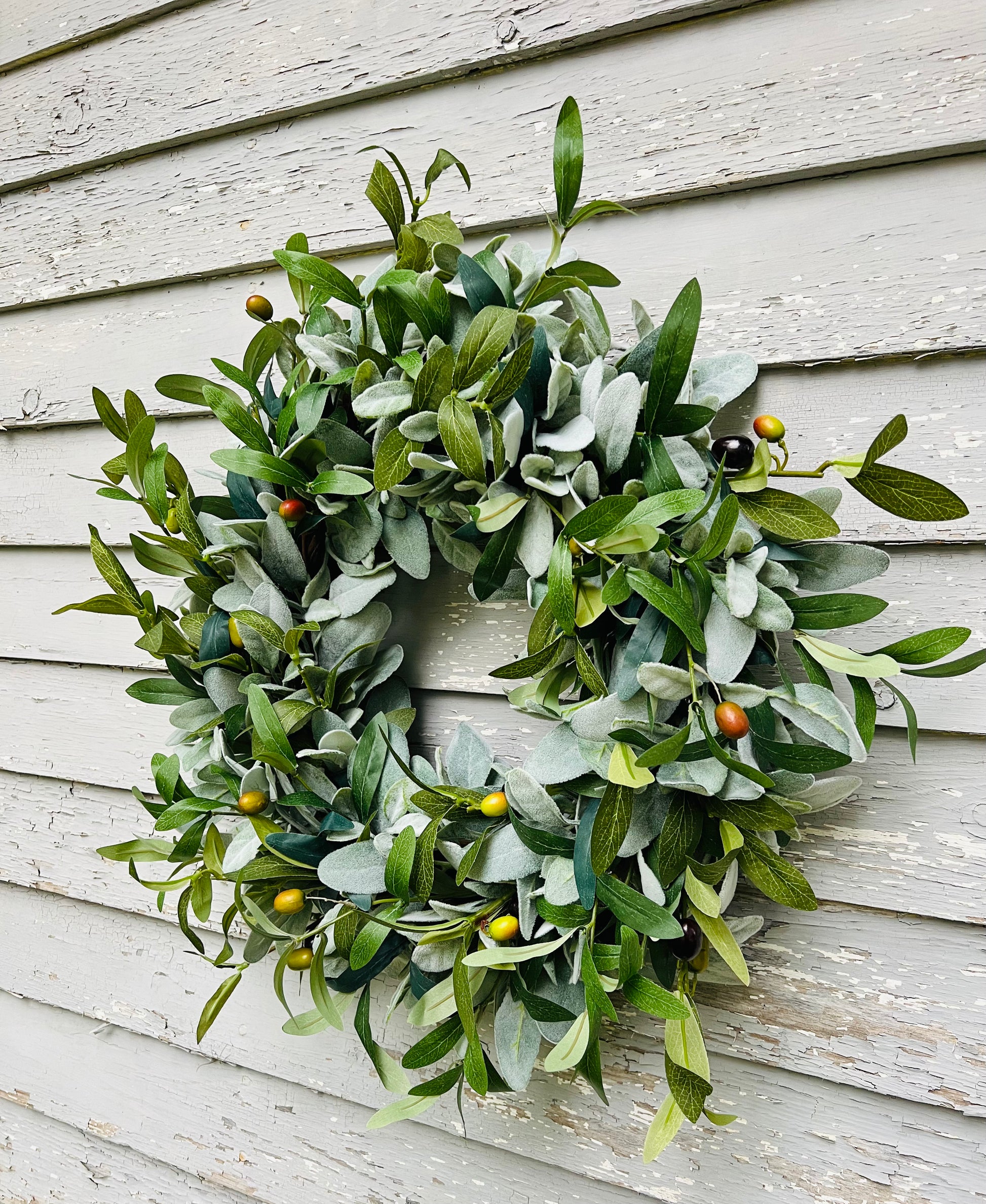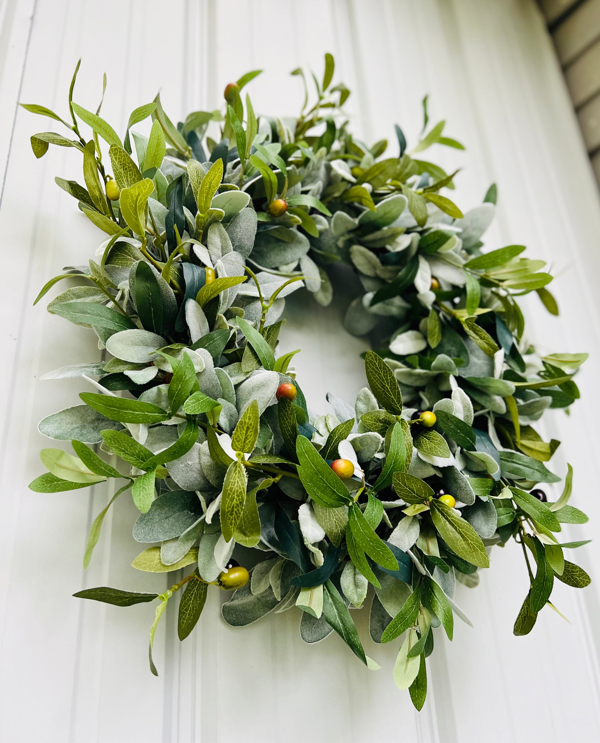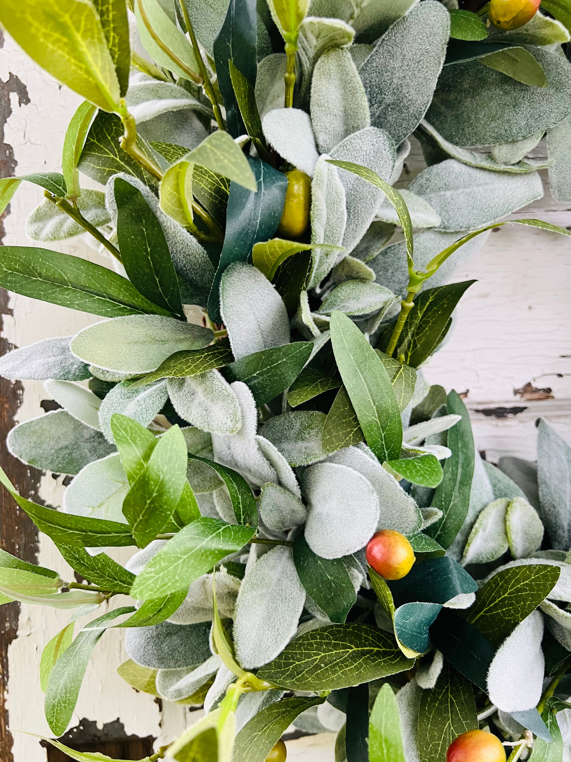 "Sunrise" is featured on a grapevine wreath base and is detailed with Lamb's Ear and olive branches.